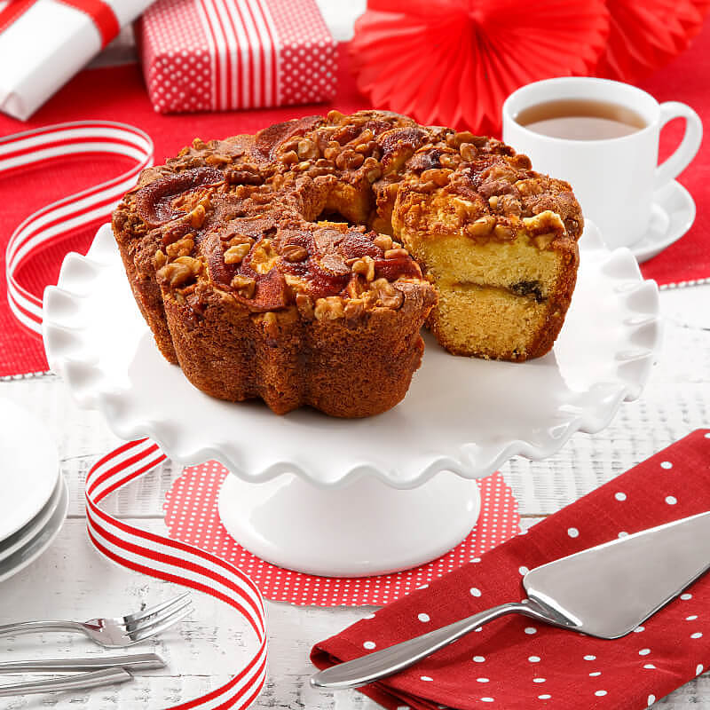 A delicious homestyle twist on the classic coffee cake! Cinnamon streusel, fresh walnuts, and Granny Smith apples make the ultimate flavor trifecta. Serve cold, or try it warmed with ice cream a la mode.