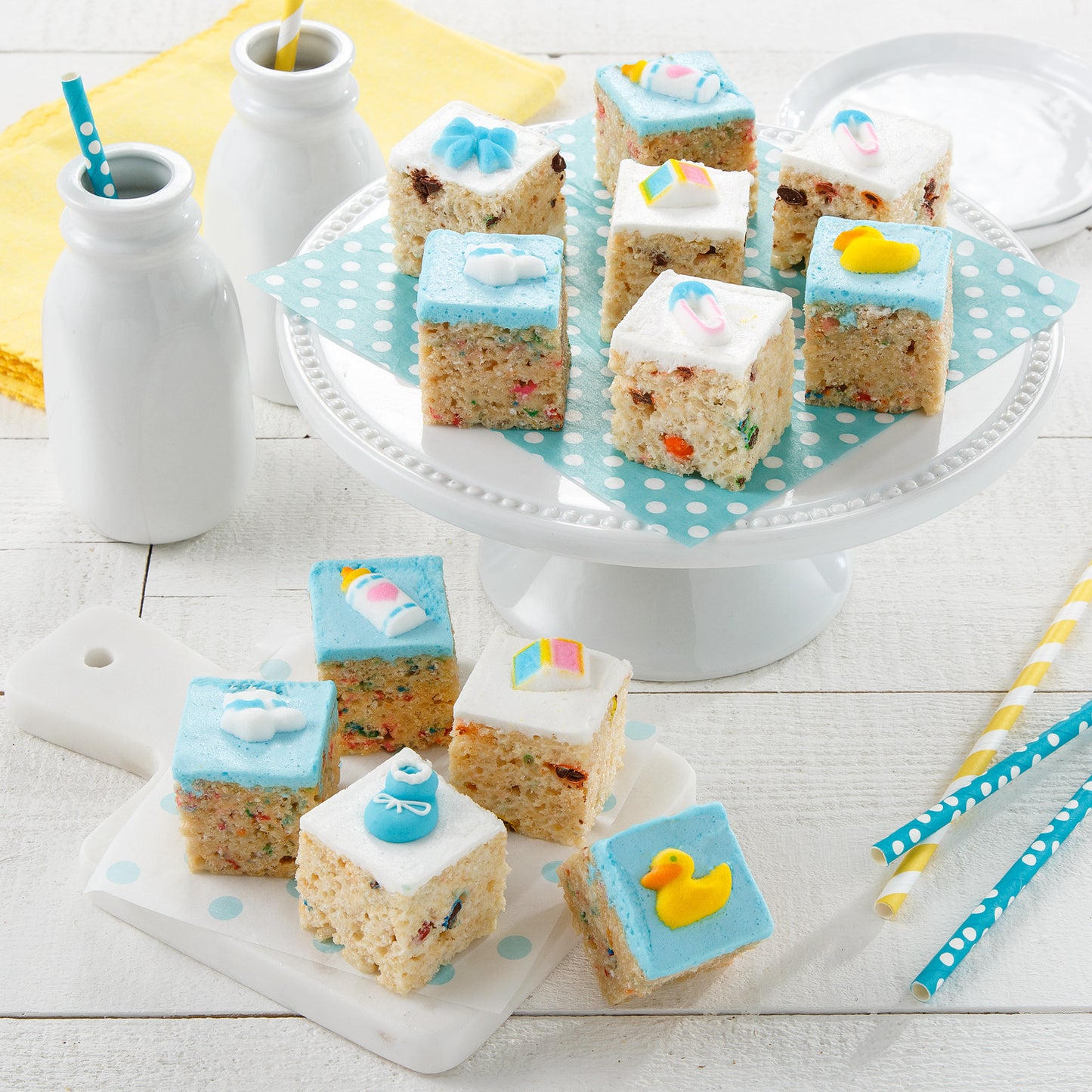 Blue and white baby themed gift with 12 adorable mini rice krispie treats that are pull-apart gooey goodness. Treats arrive in a Treat House gift box with Mrs. Fields red gift ribbon.