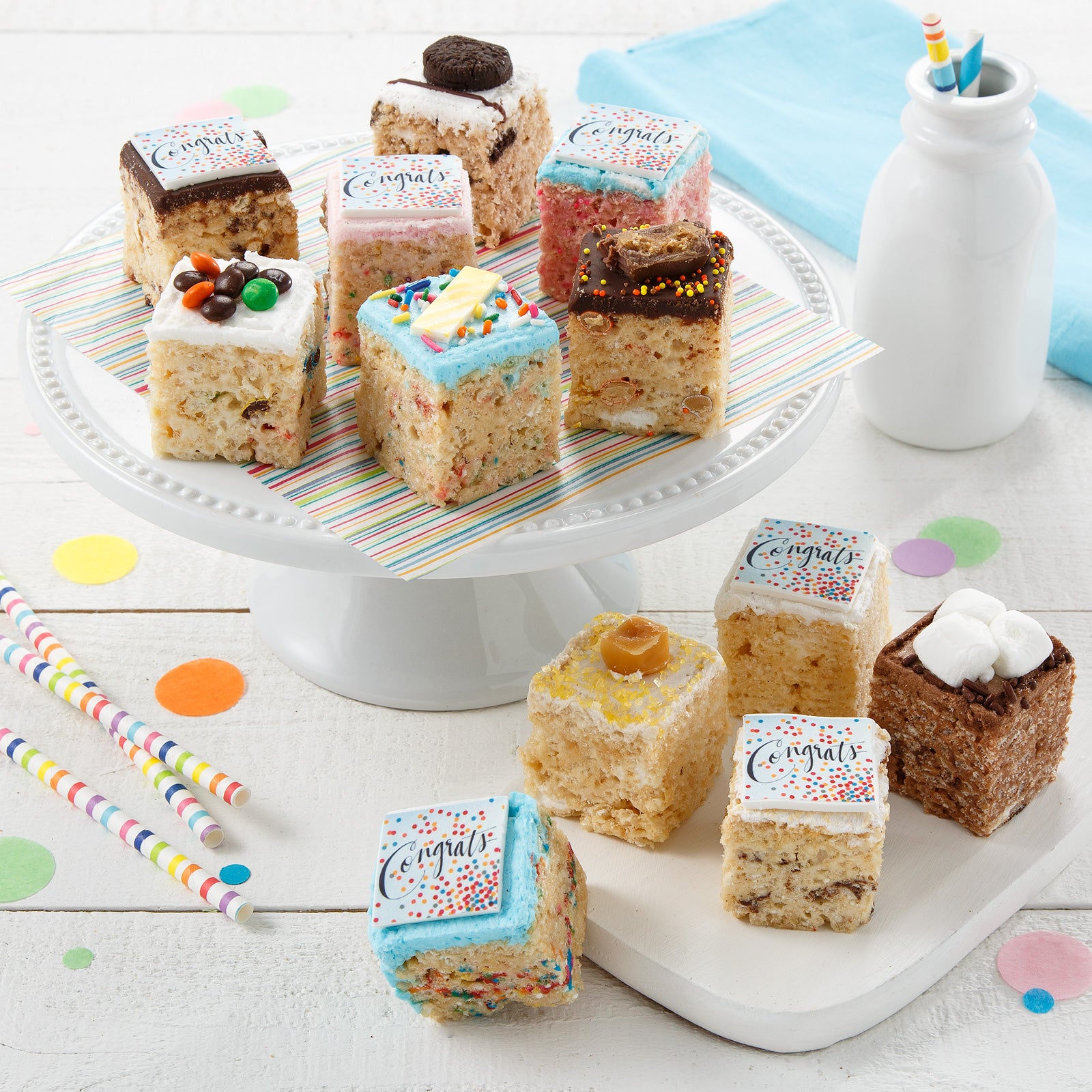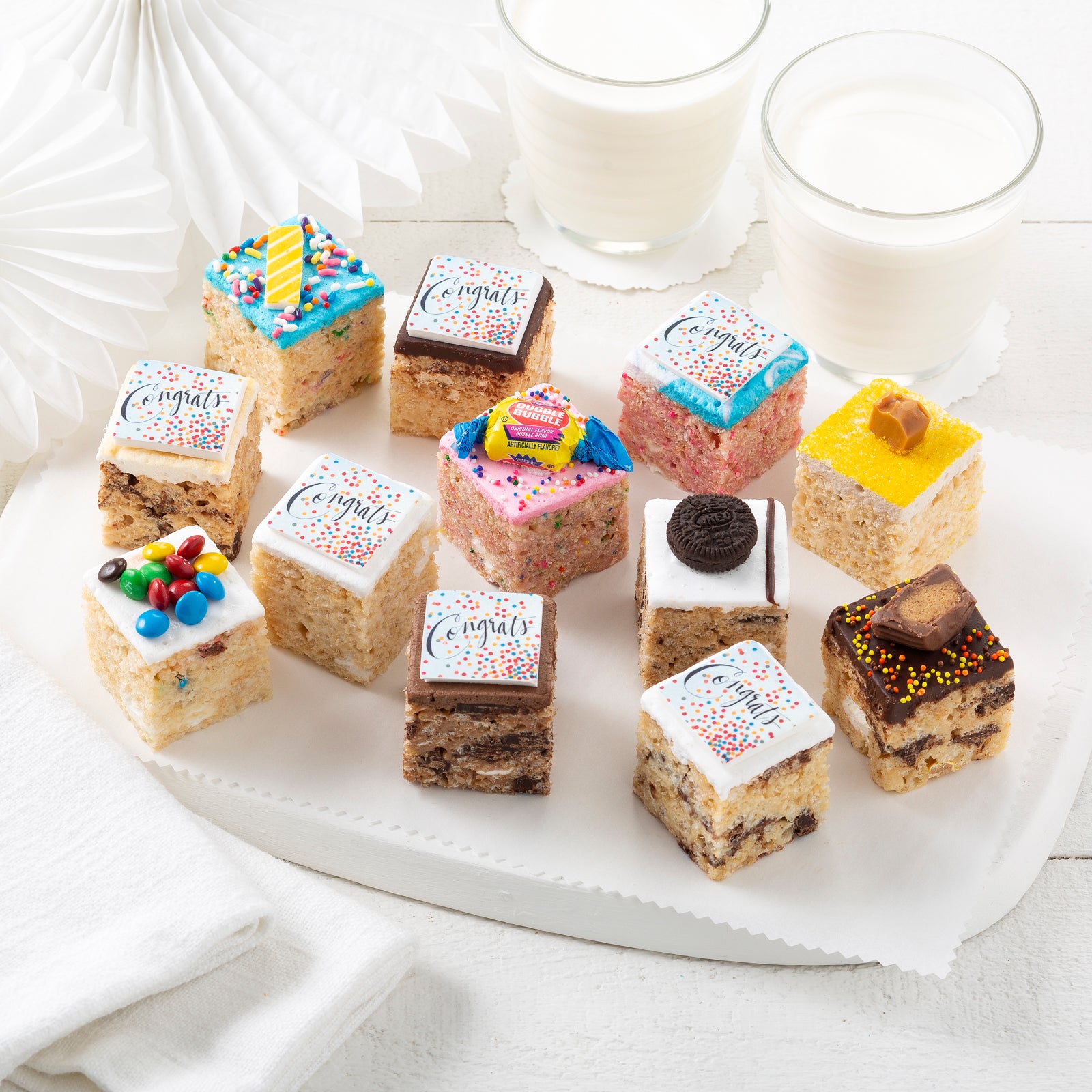 Celebrate the big day with our Congrats gift box of 12 mini rice krispie treats that are pull-apart gooey goodness. Treats arrive in a Treat House gift box with Mrs. Fields red gift ribbon. All rice krispie treats are hand-made and uniquely decorated just for you.