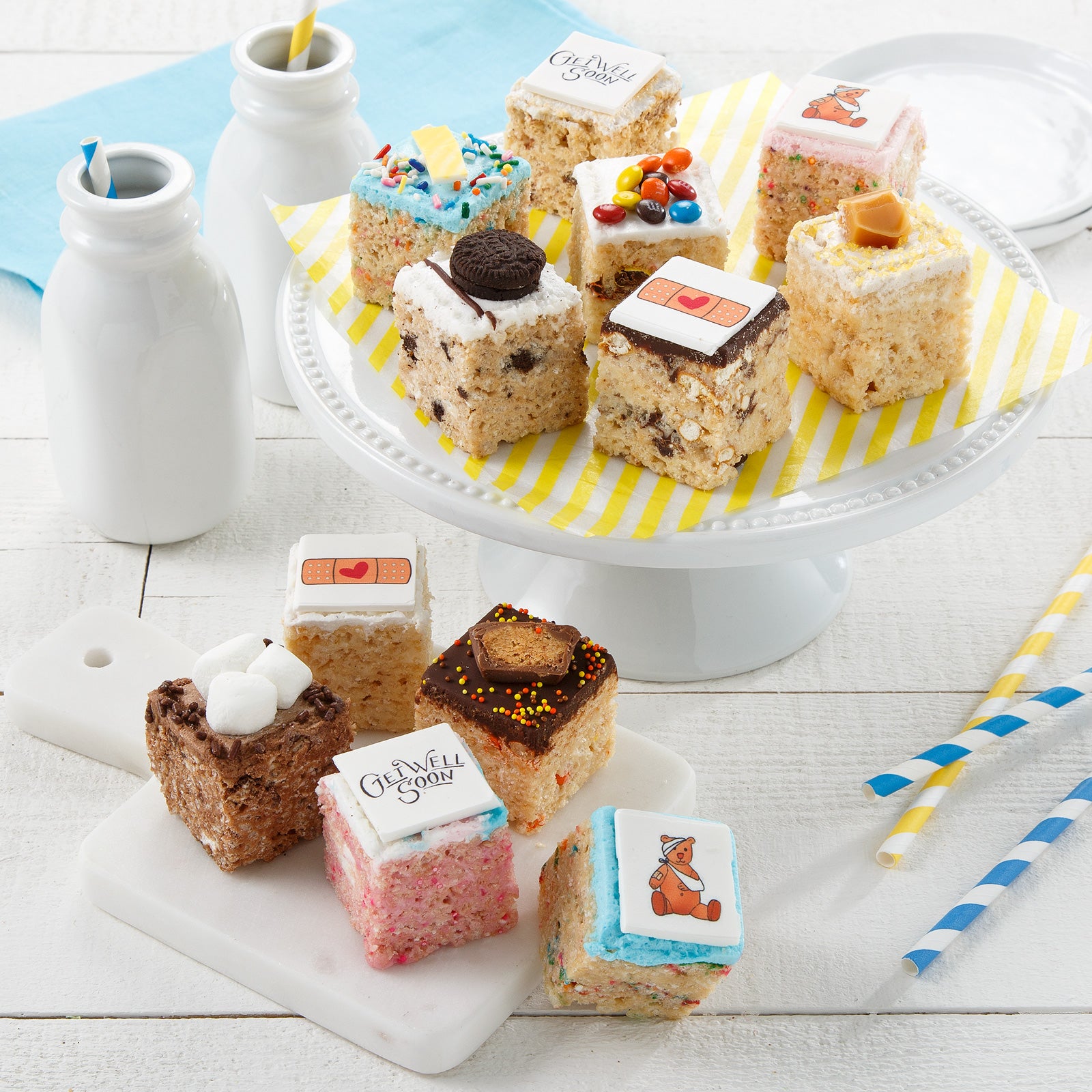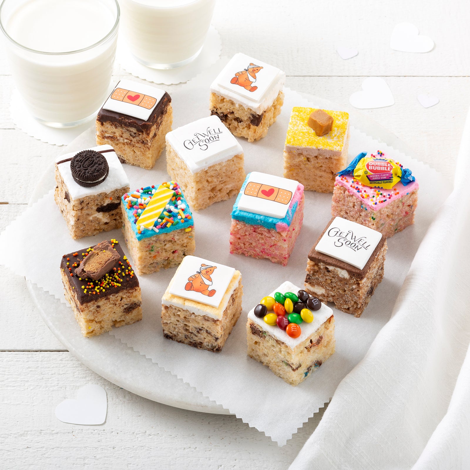Our "Get Well Soon" deluxe assortment is like sunshine in a box with 12 mini rice krispie treats that are pull-apart gooey goodness. Treats arrive in a Treat House gift box with Mrs. Fields red gift ribbon. All rice krispie treats are hand-made and uniquely decorated just for you.