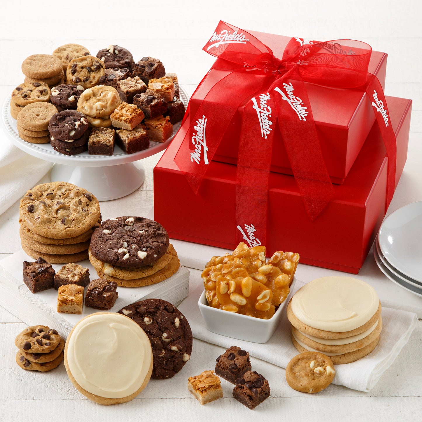 Send sweets in style with the Crimson Collection! This charming two-tiered crimson tower delivers an assortment of both original cookies and Nibblers® bite-sized cookies in five classic flavors, all soft-baked to perfection. A gift of good taste!