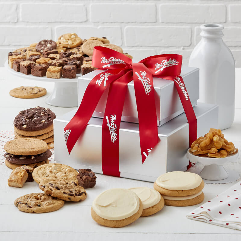Send sweets in style with the Crimson Collection! This charming two-tiered crimson tower delivers an assortment of both original cookies and Nibblers® bite-sized cookies in five classic flavors, all soft-baked to perfection. A gift of good taste!