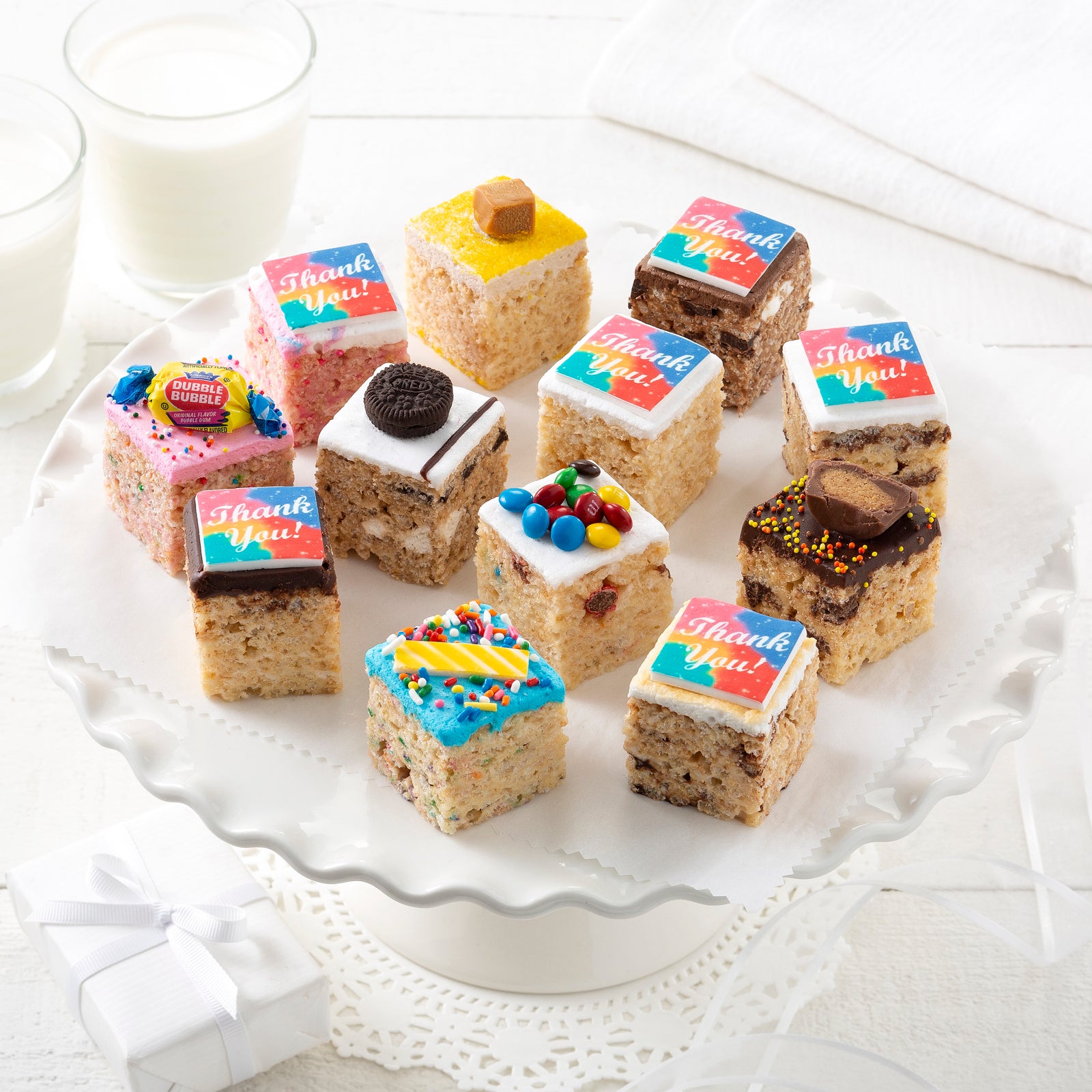 Send a Thank You message with this gift box of 12 mini rice krispie treats that are pull-apart gooey goodness. Treats arrive in a Treat House gift box with Mrs. Fields red gift ribbon. All rice krispie treats are hand-made and uniquely decorated just for you.